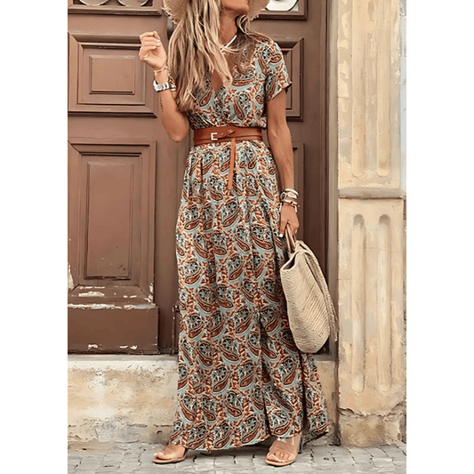 Maiken™ - Lang boheme-kjole med plisseret talje