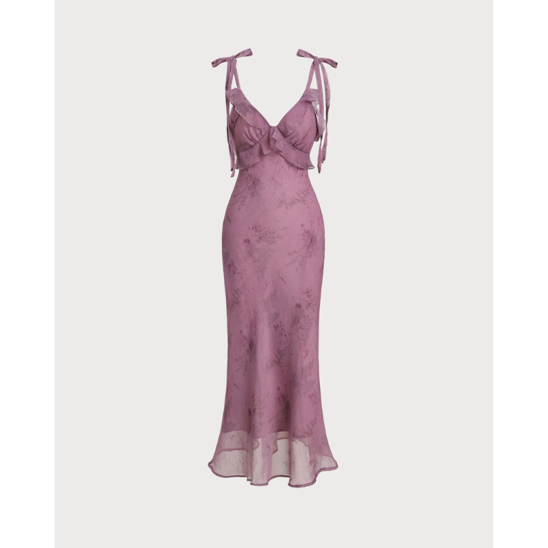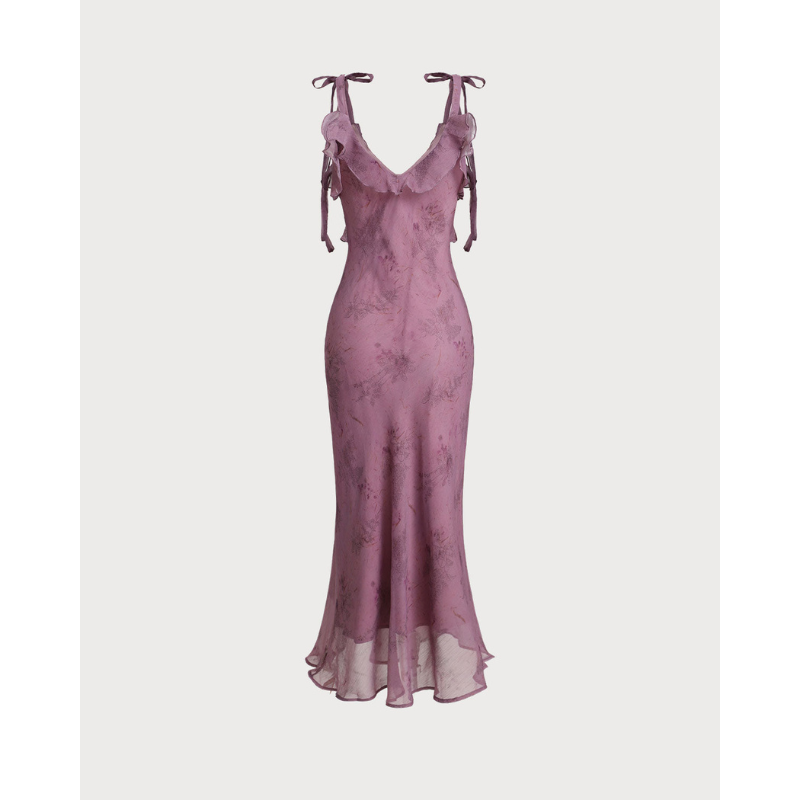 Emil™ - Lilla blomstret midikjole med flæser og bindebånd