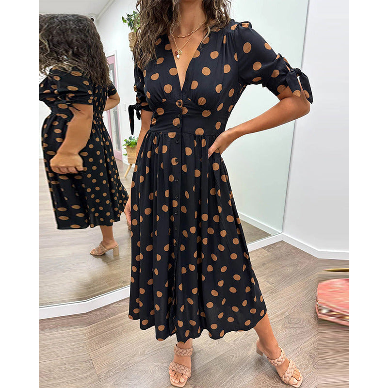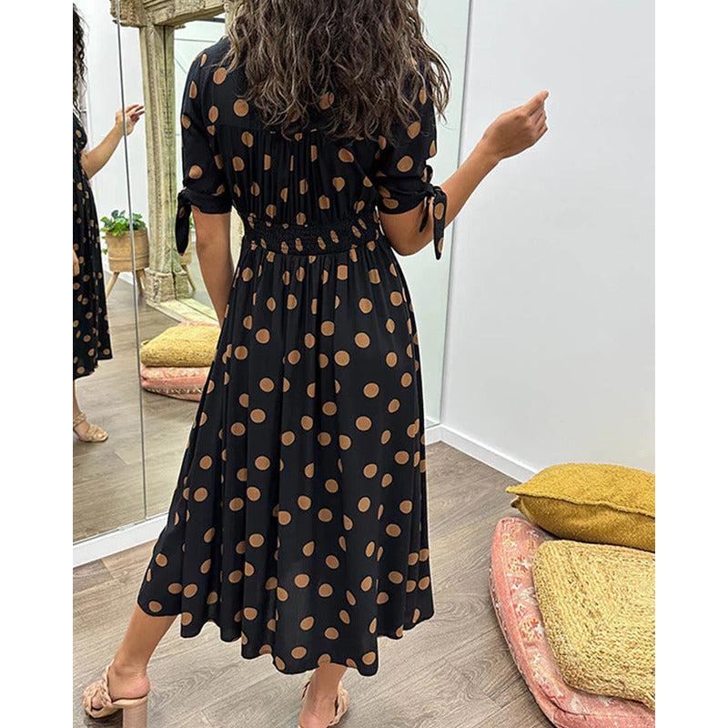 Træd ind i solskinnet med Mina™ V-hals kjolen med polkaprikker, den perfekte blanding af årgang stil og moderne femininitet. Det klassiske polkaprikkede mønster tilføjer en legende retro-vibe, mens V-hals og A-formet silhuet fremhæver din figur ubesværet. Uanset om du er på vej til brunch, havefest eller en slentretur gennem byen, giver Mina™ dig den selvsikre, ubekymrede elegance hvert skridt på vejen.